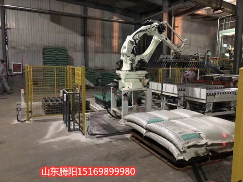 袋装码垛机器人设备从输送机上抓取料袋,按照预定的码放方式,将料袋逐个逐层码放在托盘上,将码好的满垛输出。