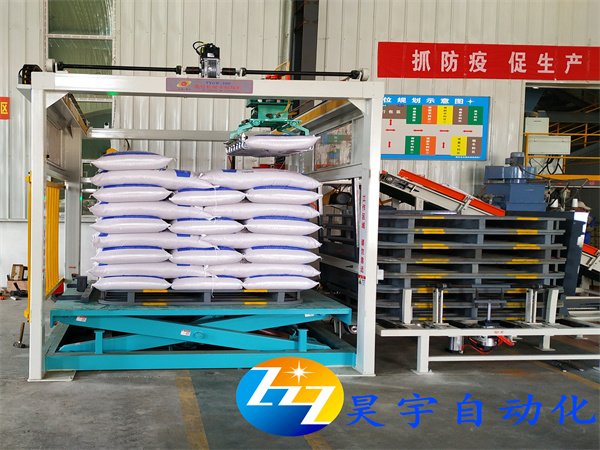 全自动高位码垛机的工作原理;将包装好的料袋经过斜坡输送机,送到整平机,曾平,包装袋到达抓取辊道,机械手抓取辊道上的料袋,然后按照设定好的轨道进行转向,堆放。高位码垛机只可设置机械手抓取式抓手来进行作业,只可码垛袋装物料。