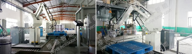 码垛机可对各种包装进行全自动码垛作业,具有速度快、整齐、自动化水平高的特点。主要有包装袋压平整理、缓冲输送机、抓取辊道、托盘机、机械手等装置组成。