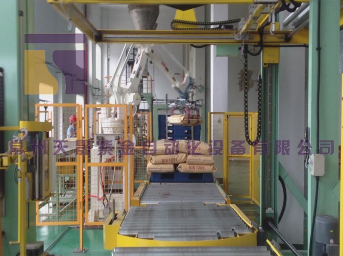 配合自动机器人码垛使用,将整垛包装好的料袋进行顶部及四周缠膜。是长时间库存或远距离运输必备设备。
