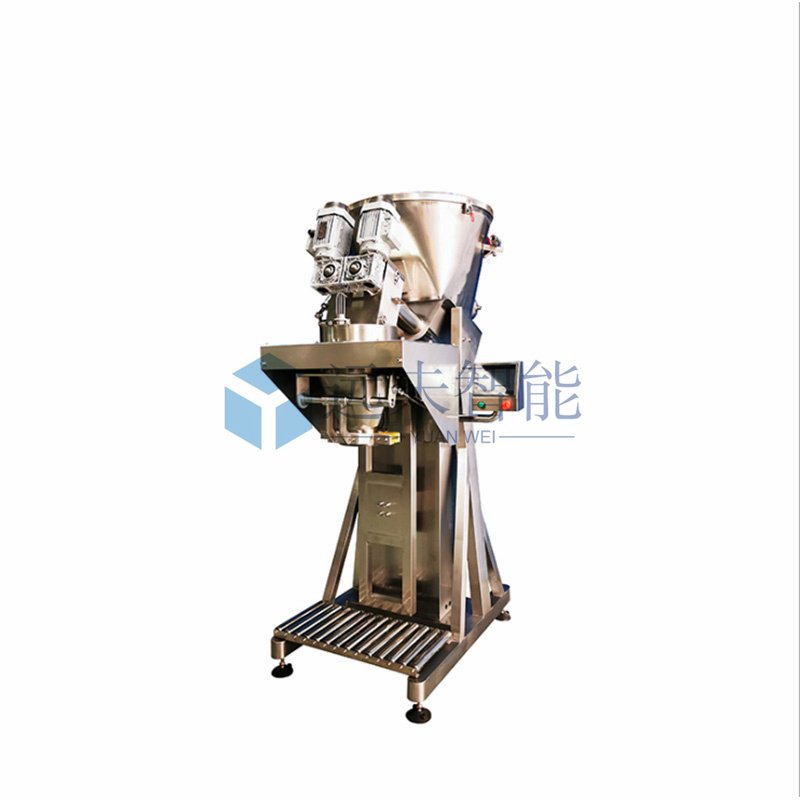 该机主要工作流程为设定好包装重量后,人工将包装袋套到气动夹袋机构,启动灌装开始按钮,夹袋机构自动将袋子夹住,然后往包装袋中进行放料,放料过程分为粗加料和精加料两个阶段,且加料过程中可选配除尘及抽真空工艺。达到标定重量后,夹袋机构自动脱开,人工将包装袋搬至皮带输送机上进行抽气、封口等工序。