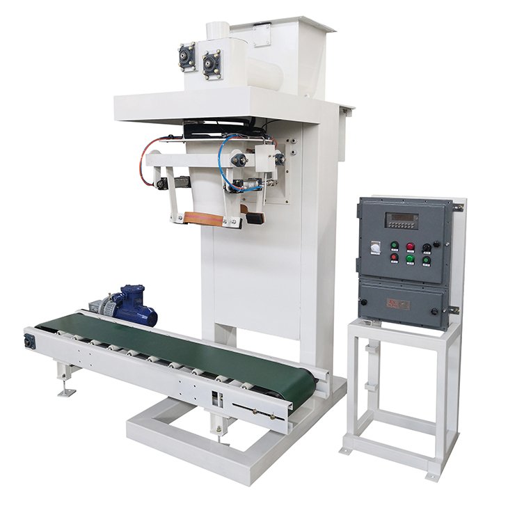 包装前需人工在仪表上设定目标重量,客户可根据需求自行调整,人工将包装袋套入下料口,拨动夹袋开关,控制系统接收到套袋信号后驱动气缸,由夹带器将包装袋夹住,同时启动给料机构将料仓物料送入包装秤,送料机构为双螺旋送料,达到目标重量时,螺旋停止给料,夹带器自动打开,包装袋自动落到输送机上,输送机将包装袋向后输送进行人工辅助缝口,向后输送,完成一次装袋过程。