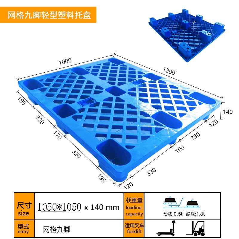 网格九脚轻型塑料托盘尺寸:1050X1050X140载重:动载0.5T/静载1.8T适用:叉车/地牛形式:网格九脚