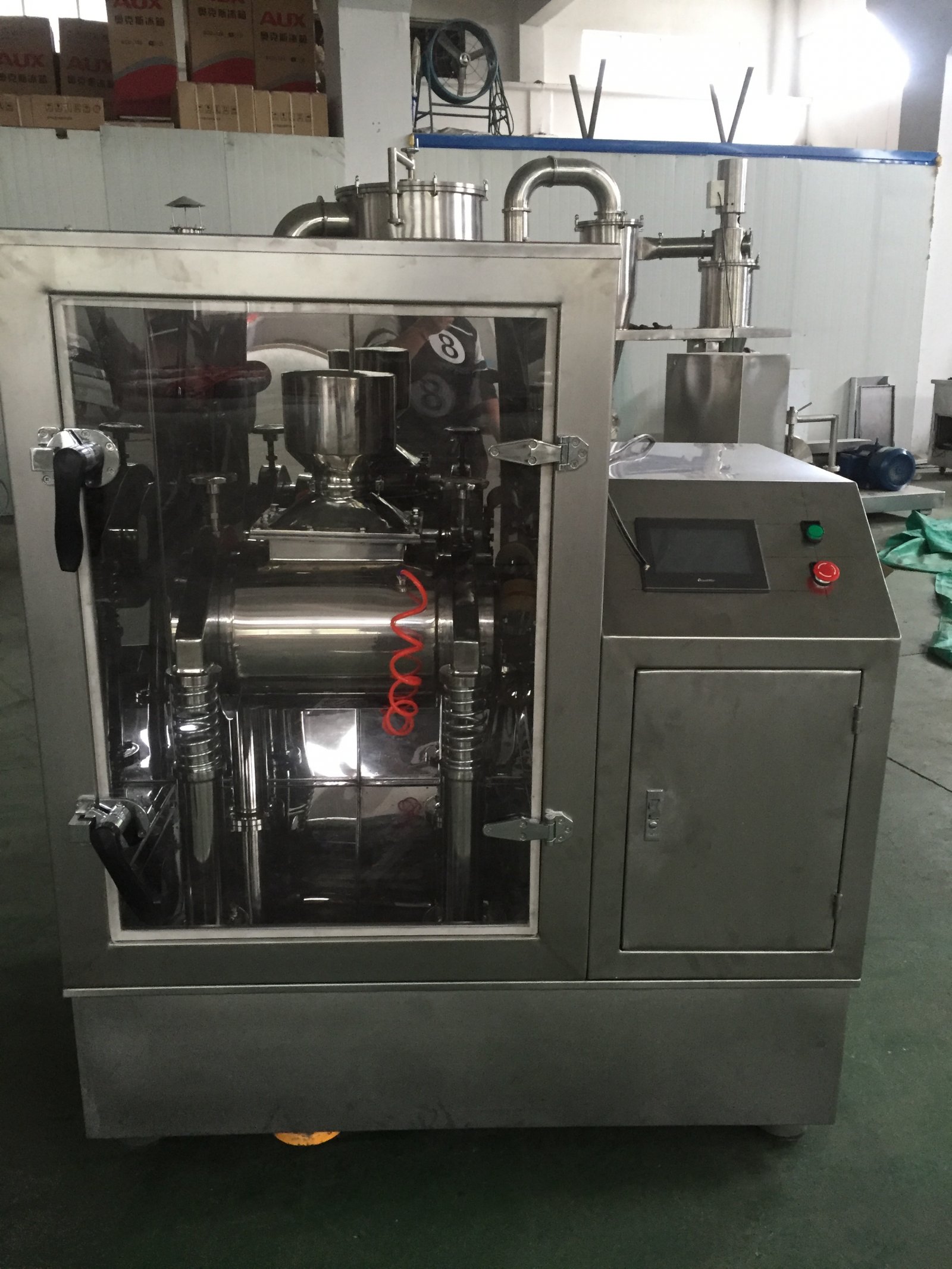 该机为卧式振动磨,物料由加料斗进入粉碎室,经振动将粉碎室内的研磨棒与物料碰撞、研磨而获得粉碎,该机配有水冷却装置,可控制粉碎室内的温度,整机按“GMP”标准设计,采用不锈钢制造,设备在全密封状态下作业,无粉尘飞扬,无环境污染。