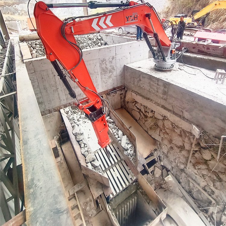 机架1,液压泵站2,操作室3,回转机构4,大臂5及大臂油缸6,二臂7及二臂油缸8,液压破碎锤9及转锤油缸10,以及液压系统,动力系统,操作系统等组成。