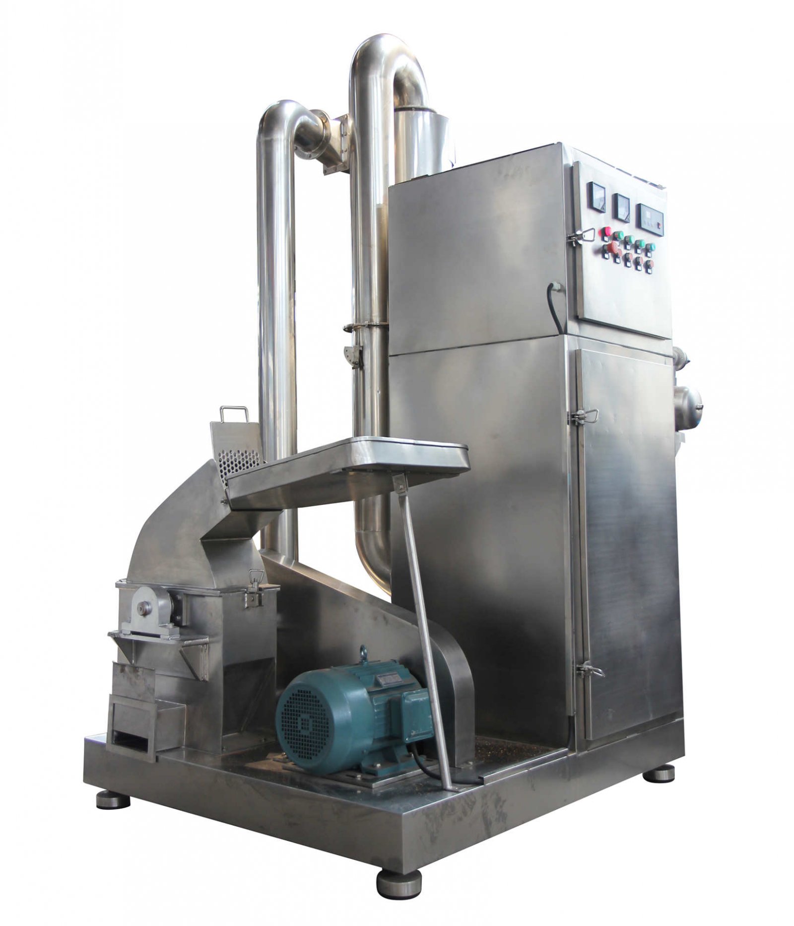 本机有主机、引风机、除尘器、电控箱四个部分组成,均可粉碎油脂含量达10%的香辛料(辣椒、甜椒、各种植物籽)、油性料、纤维料等,该机的粉碎粒度用筛网控制,常温下可以连续进行生产,机腔采用水循环冷却,粉碎后物料不变颜色,维持物料原生态和生产能力高的优势。主要适用于根、茎、叶等纤维物料,胡椒、花椒、辣椒、八角、中草药等物料的粉碎。