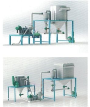 在粉碎剥离的过程中根据粉碎剥离系统的参数来控制铜、铝外排的数值,排出的铜铝纯度高,黑粉的含量极低。通过分级轮的黑粉进入旋风收集器内进行收集,在收集的过程中,极细的细粉会跟随负压系统进入除尘器内。除尘器内将物料和风进行分离,物料留在除尘器内,经净化的风由管道排出。排出后的铜铝颗粒由二次粉碎剥离设备的负压将物料引入粉碎剥离系统内再进行二次粉碎剥离,通过分级轮的物料为黑粉,黑粉内铝含量约 2% 以内,经二次剥离后的铝,经粉碎剥离设备下方的到导料螺旋排出,排出的铝纯度约 90% 以上。此工艺主要是提取高纯粉,然后将剩余未脱离干净的铝箔进行二次剥离,将再次剥商后铝纯度高。