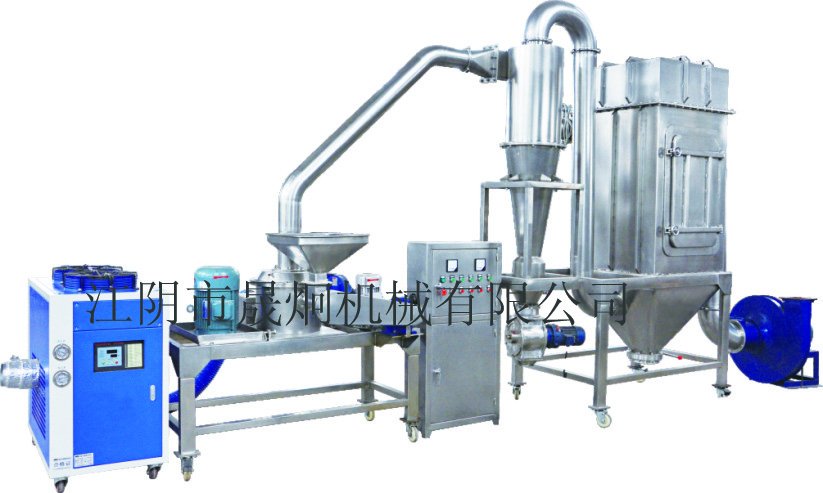 本机由主机、辅机、电控箱三个部分组成,具有风选式、无筛、无网、粒度大小均匀等多种性能。物料由料斗经螺旋输送器进入粉碎室,粉碎物经高速刀片剪切获得粉碎,通过负压风运的方法把物料运入旋风分离器,袋式除尘器,排出物料达到产品的要求。冷冻机有风冷型、冷冻液型,根据物料而定。不含油性、粘性的物料可以不选用冷冻机。