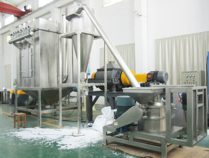 【工作原理】物料由加料系统均匀的送入粉碎室受到高速旋转的粉碎盘的强烈冲击,同时受到离心力的作用,与粉碎齿圈发生碰撞,受到剪切、摩擦、碰撞等多种综合力的作用,使物料粉碎,被粉碎的物料随气流运动到分级区,通过变频调节的分级轮,对粗细物料进行分离,符合细度要求的产品随气流进入旋风收集器和除尘器收集,粗物料返回分级区二次粉碎。