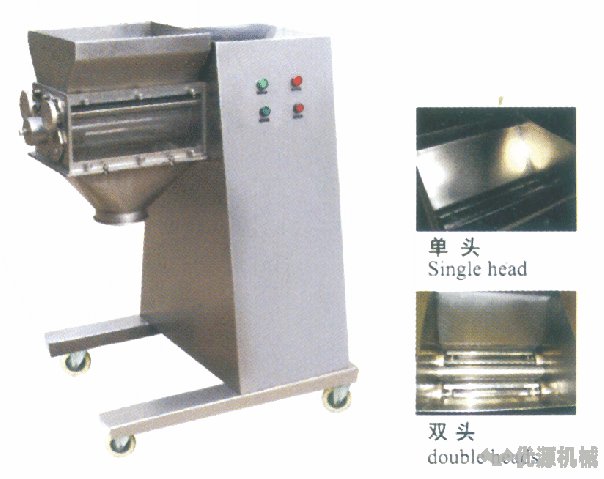 通过机械传动使滚筒360°往复摆动,将物料从筛网中挤出制成颗粒或粉碎制粒。