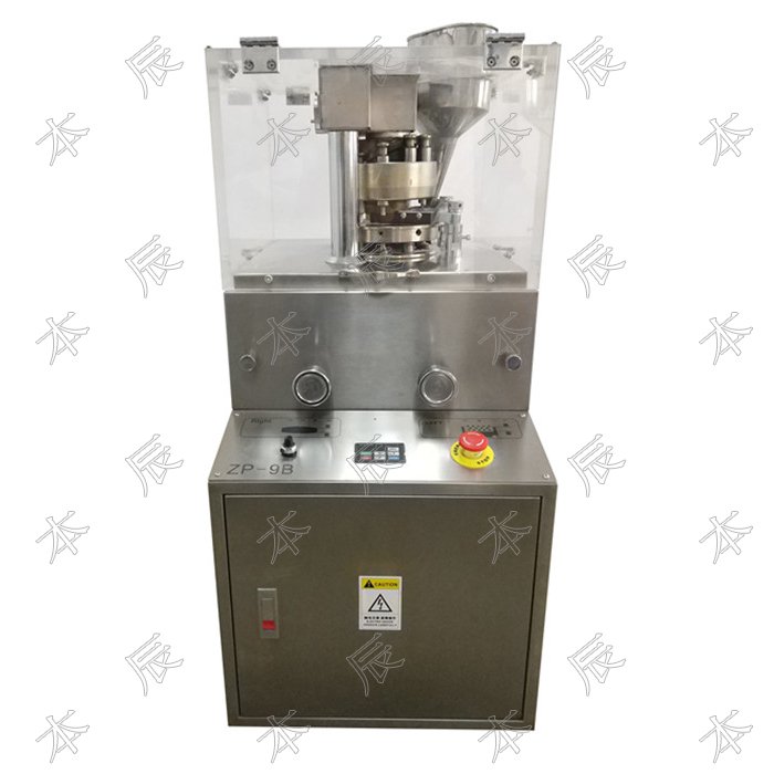 旋转式压片机ZP-7B系列可将粉剂、小颗粒压制成20毫米以下的圆形或异型片剂,产量为9000-15000片/小时,片剂厚薄、压力大小、压片速度均可根据客户的要求随意调节。该机外形简洁、小巧,重量轻,操作简便,适合制药、食品、化工、电子等行业使用。配有过载保护装置,当压力过载时,能自动停机。本机配有电磁制动电动机和其它安全保护装置,运行时也能调整与操作。