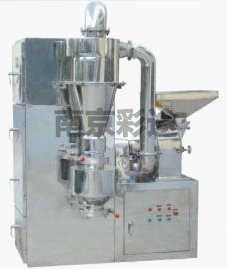 由加料斗、分级轮、粉碎刀片、齿圈、粉碎电机、出料口、集装箱、吸尘箱等部分组成,物料由加料斗进入粉碎室,通过高速旋转的刀片进行粉碎,调 节分级轮与分级盘的距离来达到要求的料继续在粉碎室中粉碎。集料箱布袋产生的粉尘由吸尘箱收集。该机组按"GMP";的标准设计,结构简单、操作方便、噪音 小、产量高,机器采用优质不锈钢材料制造,粉碎过程中无粉尘飞扬。