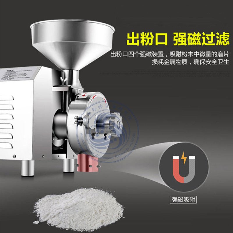 五谷杂粮磨粉机主要有进料斗、转子、齿盘、筛子、机壳、机座、电机等部分组成。当物料进入粉碎室后,在圆齿、扁齿不断打击和齿盘搓撞作用下,迅速破碎成细粉或浆状、在离心力和气流作用下,通过筛孔经出料口排出室外。