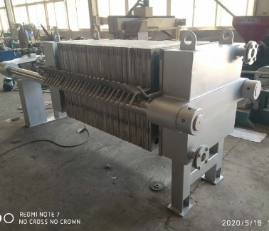 板与框相间排列而成,在滤板的两侧覆有滤布,用压紧装置把板与框压紧,即在板与框之间构成压滤室。在板与框的上端中间相同部位开有小孔,压紧后成为一条通道,加压到0.2~0.4MPa的污泥,由该通道进入压滤室,滤板的表面刻有沟槽,下端钻有供滤液排出的孔道,滤液在压力下,通过滤布、沿沟槽与孔道排出滤机,使污泥脱水。国内外已开发出自动化的板框压滤机。板框压滤机比真空过滤机能承受较高的污泥比阻,这样就可降低调理剂的消耗量,可使用较便宜的药剂(如FeSO4·7H2O)。当污泥比阻为5×1011~8×1012m/kg时,可以不经过预先调理而直接进行过滤。板框压滤机其泥饼产率和泥饼含水率,应根据试验资料或类似运行经验确定。泥饼含水率一般可为百分之75~百分之80。