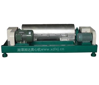 电机带动无孔转鼓及同心安装的输料螺旋,以一定的差速同向高速旋转,物料由进料管连续引入输料螺旋内筒,加速后进入转鼓,在离心力作用下,较重的固相物沉积在转鼓壁上形成沉渣层。输料螺旋将沉积的固相物连续不断地推至转鼓锥端,经排渣口排出转鼓及机外。较轻的液相物则形成内层液环,由转鼓大端的溢流口连续溢出转鼓,经排液口排出机外