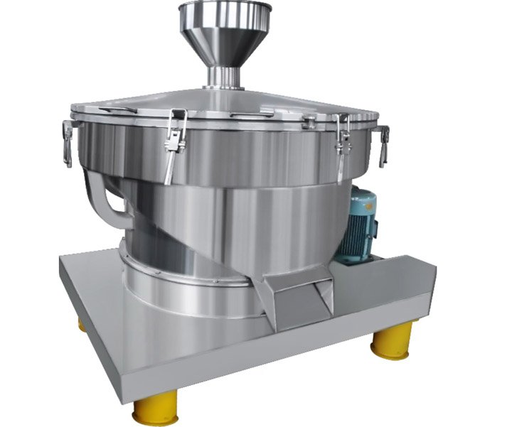 本离心机主要同转鼓、传动座、机座、内机壳、外机壳和上盖组成。锥型转鼓内表面装有筛网,中间装用布料器。物料从安装在与转鼓同铀中心同一轴线的进料管垂直进入,在离心力的作用下,实现固液分离,固相物料在网面上移至大端而完成脱液,并借肋于惯性实现卸料,通过内机壳与外机壳的环形通道下落进行收集。