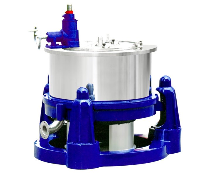 待分离的物料经进料管进入高速旋转的离心机转鼓内,在离心机力场的作用下,物料通过滤布(滤网)实现过滤,液相经出液管排出,固相则截留在转鼓内,待转鼓内滤饼达到机器规定的装料量时,停止装料,对滤饼进行洗涤,同时将洗涤液滤出,达到分离要求后,离心机低速运转,操作手动刮刀装置,通过先将刮刀径向切入,再轴向刮料,将转鼓中的滤饼刮下,刮刀装置复位,完成一次工作循环。