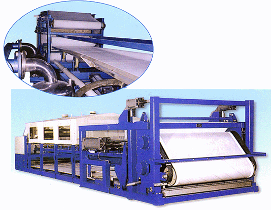 真空带式压榨过滤机是以滤带为过滤介质,充分利用物料的重力、真空吸力、S型辊挤压力实现固液分离的高效分离设备。采用整体可拆式过滤盘作为真空室,以S形挤压辊作为外力,滤带在电机拖动下做连续运行,过滤行程开始时,滤盘在真空状态下与滤带同步运行,在非真空状态下滤盘与滤布作相对运行。物料通过料浆分布器均匀布在真空滤盘的过滤带上,滤带上料浆在真空吸力的作用下进行抽滤,知道真空滤盘碰到接近开关位置,下滤带的滤饼在电机的拖动下继续运行并进入S形挤压辊同时上滤带在物料进入S形挤压辊后进行挤压以降低滤饼含湿量。过滤、洗涤、再过滤、挤压后的滤饼经刮刀装置将滤饼剥离卸除,滤布经自动再生装置清洗后,再经过一组支承辊和纠偏装置重新进入过滤区,集液罐滤液随着滤盘返回同时排出,挤压辊中的滤液流入收集盘。通过这样周而复始的抽滤、洗涤、再抽滤、挤压,从而事先固液分离的目的。