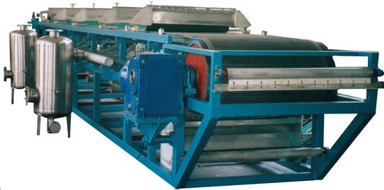 橡胶带式真空过滤机是我厂在引进国外同类产品技术基础上,自主开发的一种高效过滤固液分离设备。该设备采用了固定真空盒,胶带在真空盒上滑动,真空盒与胶带间构成运动密封的结构型式。它能连续自动完成过滤、滤饼洗涤、卸渣、滤布再生等工艺操作,并且母液有与滤饼洗涤液可以分段收集。具有过滤效率高、生产能力大、洗涤效率好,滤饼水分低、操作灵活、维护简单等优点。胶带机经我厂多年改进和完善,产品的技术性能和质量已达到了国际**,已广泛应用于冶金、矿山、化工、电厂湿法烟气脱硫、煤化工、造纸、食品、制药及环保等行业。