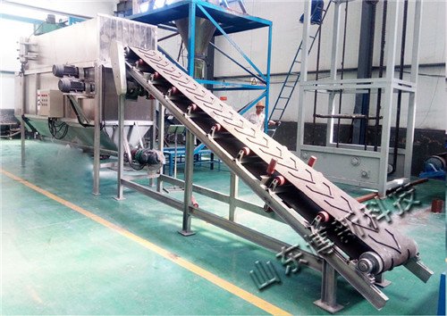 1、袋装粉粒体物料由皮带输送机传送至45度角的滑板上并依靠重力沿滑板下滑。