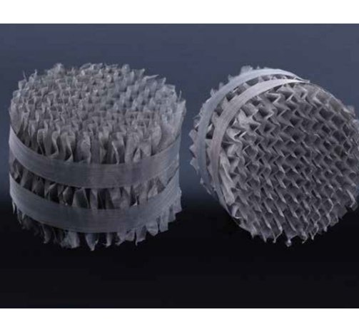 丝网波纹填料由压成波纹的丝网片排列而成,波纹片倾角30 ° 或50 ° ,相邻两波纹片方向相反,在塔内填装时,上下两人盘填料交错90o叠放。具有高效、降压低和通量大的优点,产品有BX、CY型,常于难分离和热敏性物系的真空精馏,常压精馏和吸收过程。
