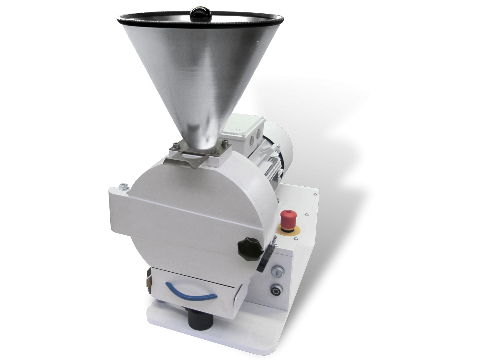 物料经喂料斗进入粉碎室。喂料斗下方的插板可精确控制加料量。粉碎室内壁上固定着四个特制的切刀,安装在电动机轴端的转子上装有六个可换可调的切刀,刀口方向与内壁上的相反以便磨碎物料。调换粉碎室下部的筛网可以控制物料的粗细度。达到细度的物料落入收集盘中,筛上物继续被粉碎直至达到所需细度。