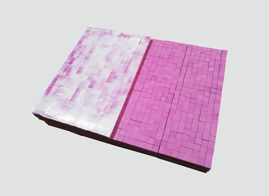 直粘型耐磨陶瓷衬板(NMC-Z)是先将耐磨陶瓷片粘贴在胶纸上,形成不同大小的陶瓷衬板。使用时再用无机耐高温粘合剂(GWJ-350)直接粘贴在设备内壁,经固化后形成牢固防磨层。
