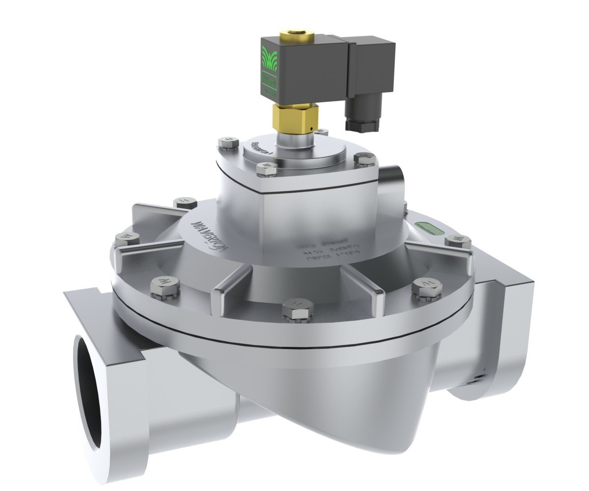 W-SP-TG型电磁脉冲阀,阀的进出口夹角为180°(进出口中心线为同一直线),是直通阀。它提供的清灰震动气流适用于各种滤袋(圆袋、异形袋、金属纤维袋)、滤筒、陶瓷管和塑烧板等过滤元件的清灰。
