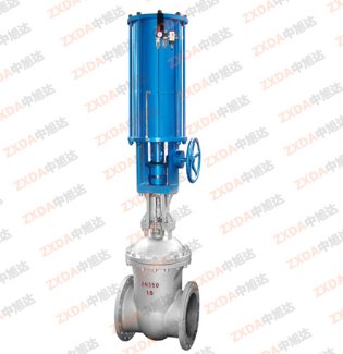 Z6S41系列气动带手动楔式闸阀是具有气动执行机构(双层气缸,并带有缓冲机构)和手动及其保护机构(手动和可自锁的气动-手动转换装置)的低支架明杆闸阀。该阀由于采用双层气缸结构,其与单气缸式气动闸阀相比,提升力增大了一倍。这就从根本上解决了单气缸气动闸阀的某些阀体内楔死而打不开的弊病。而且,由于该阀具备缓冲机构,能有效地减速轻了关闭阀门时,由于活塞下行冲击而造成的阀板车密封面和阀体密封面的磨损,同时,也能避免闸板卡死的现象。