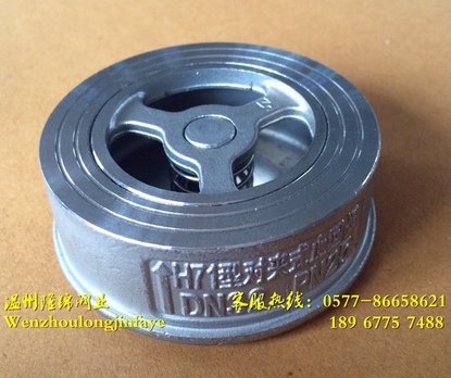其中不锈钢对夹式止回阀就属于这种类型的阀门,它包括旋启式止回阀和升降式止回阀。旋启式止回阀有一介铰链机构,还有一个像门一样的阀瓣自由地靠在倾斜的阀座表面上。为了确保阀瓣每次都能到达阀座面的合适位置,阀瓣设计在铰链机构,以便阀瓣具有足够有旋启空间,并使阀瓣真正的、全面的与阀座接触。阀瓣可以全部用金属制成,也可以在金属上镶嵌皮革、橡胶、或者采用合成覆盖面,这取决于使用性能的要求。旋启式止回阀在完全打开的状况下,流体压力几乎不受阻碍,因此通过阀门的压力降相对较小。升降式止回阀的阀瓣座落位于阀体上阀座密封面上。此阀门除了阀瓣可以自由地升降之外,其余部分如同截止阀一样,流体压力使阀瓣从阀座密封面上抬起,介质回流导致阀瓣回落到阀座上,并切断流动。根据使用条件,阀瓣可以是全金属结构,也可以是在阀瓣架上镶嵌橡胶垫或橡胶环的形式。像截止阀一样,流体通过升降式止回阀的通道也是狭窄的,因此通过升降式止回阀的压力降比旋启式止回阀大些,而且旋启式止回阀的流量受到的限制很少。本类阀门在管道中一般应当水平安装。