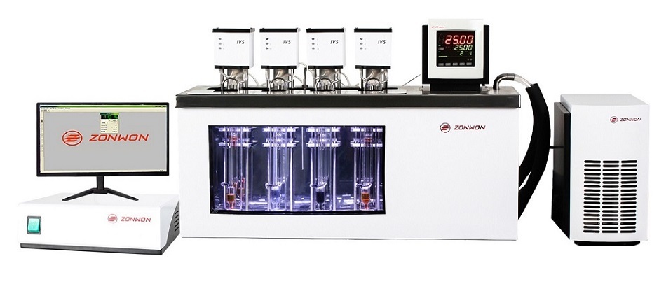 中旺全自动运动粘度仪IVS300-4依据ISO、ASTM、DIN、GB等标准设计,适用于乌氏粘度计的自动测量,系统由粘度测量台、精密恒温槽、流经式制冷器、主控制器和软件组成,可计算得到运动粘度、动力粘度、相对粘度、特性粘度。粘均分子量等,广泛应用于聚酯PET、聚丙烯酰胺PAM、锦纶、有机硅、氨纶、腈纶、聚乳酸等聚合材料领域。