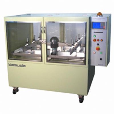 该设备是测定汽车用天窗玻璃和安装工具的粘着强度试验机。天窗玻璃的安装工具固定在手柄上,从下部通过振子对玻璃中央施加压力,测定从粘着部分脱落时的负重,或者施加一定的负重测定粘着面的状态。