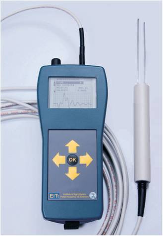FOM/mts基于时域反射技术(TDR)用于野外原位土壤含水量、温度和盐度(体积电导率)的测量。该仪器由电池供电,微电脑控制,借助于野外探针进行自由的周期性测量或在线测量土壤湿度、温度和盐度,通过几种不同的方式显示土壤剖面各参数分布情况。FOM/mts装载了一个160×128点的显示器和同时进行TDR信号追踪。TDR信号追踪是对探针电压脉冲往返程中电压对时间的记录,这有助于检测脉冲衰减。FOM/mts根据Malicki 校准法(Malicki et al., Eur. J. Soil Sci., 64, 1996)进行体积含水量的读数或依据用户的设定进行表观介电常数的读数。