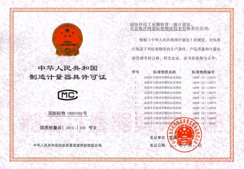 标准物质用途:主要在液压污染控制领域用于校准/检定液体自动颗粒计数器,确认和评价分析方法、考核人员操作水平、监控测量过程质量和技术仲裁等。