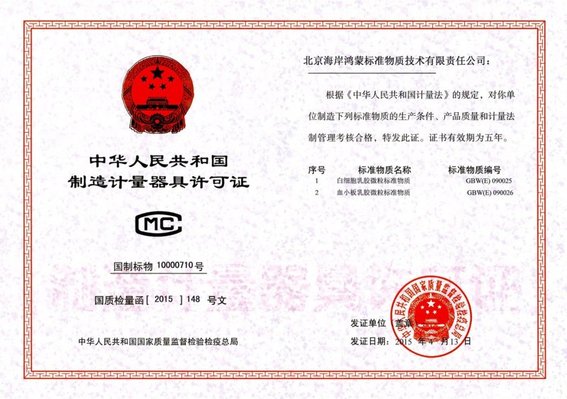 标准物质用途:测定血小板计数的血细胞计数仪的标定,也可用于对血小板计数的血细胞计数仪法和光学显微镜直接计数法进行室内质控和室间质评。