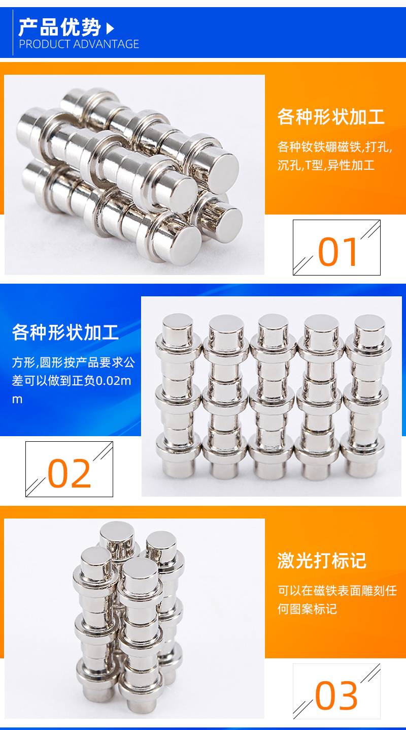 双头异形磁铁,顾名思义,是具有两个不同形状或尺寸的磁极端的磁铁,其形状不常规,经过特定的加工(如切割、开槽等)制成。它通常由钕、铁、硼等原料混合烧结而成,并经过切割和表面处理(如电镀)以增强其防腐和防锈能力。