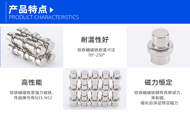 高磁能积与矫顽力:双头异形磁铁具有极高的磁能积和矫顽力,可以吸起相当于产品自身重量数百倍的重物(例如,可吸起相当于产品自身重量的640倍的重物)。