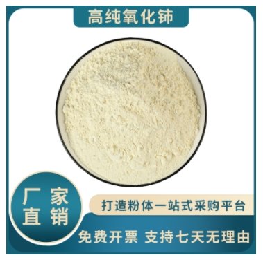 淡黄或黄褐色助粉末。密度7.13G/CM3。熔点2397°℃。不溶于水和碱,微溶于酸。在2000°C温度和15MPA压力下,可用氢还原氧化铈得到三氧化二铈,温度游离在2000°C间,压力游离在5MPA压力时,氧化铈呈微黄略带红色还有粉红色,其性能是做抛光材料、催化剂、催化剂载体(助剂)、紫外线吸收剂、燃料电池电解质、汽车尾气吸收剂、电子陶瓷等。