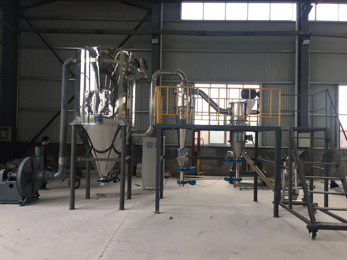 【性能特点】FW卧式单转子气流分级机适用于干法微米级产品的精细分级,可分级球状、片状、针状的颗粒,也可对不同密度的颗粒进行分级。 分级产品的粒度可达D97:2~45微米,产品粒度无级可调,品种更换极其方便。 分级效率(提取率)60%~80%,流动性好的物料分级效率就高,反之效率降低。 采用卧式分级涡轮装置,转速高,顶点切割准确。 可与球磨机、振动磨、雷蒙磨等粉磨设备串联使用,组成闭路循环。 控制系统采用PLC自动控制,运行状态实时显示,操作简便。 系统负压运行,粉尘排放量不超过40mg/m3设备噪音通过采用隔音措施,不高于75dB(A)。