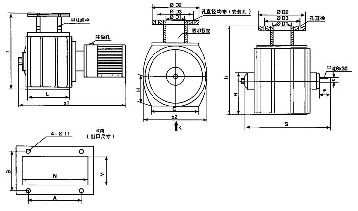 入口/出口:入口为圆口并配有透明视窗,以便观察物料的流动状况;出口为方形增大了出口