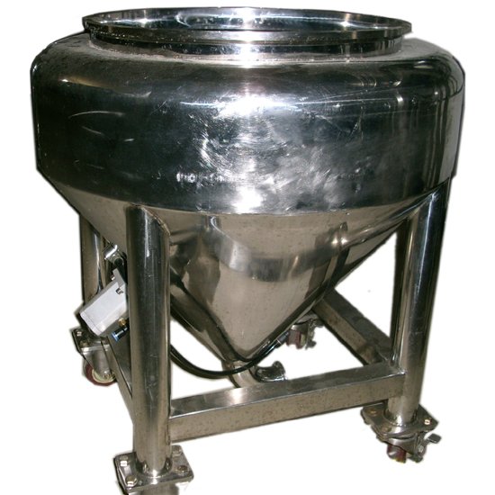 材质304不锈钢,四角有轮子,可移动带刹车装置,上面配两个气动振动器,料仓高度1000mm左右,上口直径800mm左右,下料口内径50mm,其他规格可定制。