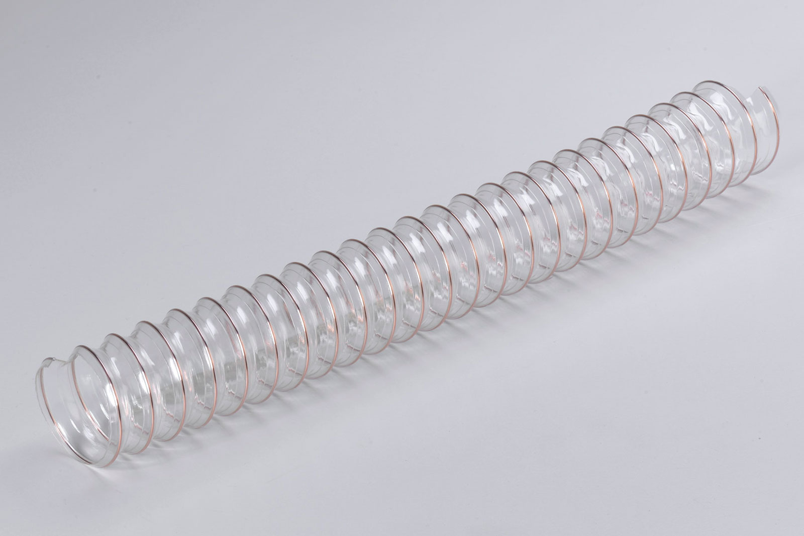 聚酯型聚氨酯材质,镀铜钢丝螺旋加强。 壁厚范围: 0.35至0.50毫米 可以5: 1的体积比压缩, 便于搬运, 节约成本。 机械特性卓越,尤其在动态应用中,非常轻质和柔韧, 弯曲半径小, 耐磨损, 耐矿物油及多数的化学品。 不含卤素 不含邻苯二甲酸盐 软管两端螺旋钢丝接地可排静电。