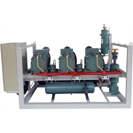 低温复叠活塞式冷水机组是由两个或两个以上独立的制冷循环组成,分别被称为高温循环和低温循环。在各单独的制冷系统中充有不同性质的制冷剂,高温循环通常采用中温制冷剂,低温循环中通常采用低温制冷剂。每一循环均可采用单级或双级压缩制冷循环。这两个部分通过一个冷凝蒸发器联系起来,它即是低温循环的冷凝器,也是高温循环的蒸发器,即高温循环中制冷剂的蒸发用来冷凝低温循环中的制冷剂。这样,低度温循环吸收的热量(制冷量)传给高温循环的制冷剂,高温循环的制冷剂再将热量传给环境介质。