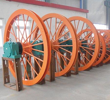 天轮可分为三种:井上固定天轮、凿井及井下固定天轮、游动天轮。直径为3.5m时采用模压焊接结构;直径小3m时,采用整体铸钢结构,直径为4m时,采用模压铆接结构。