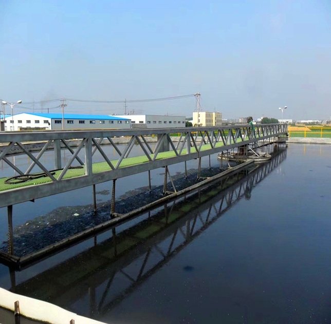 本机适用于中心无支墩的幅流式或竖流式沉淀池(φ<15m)的机械排泥。该机设有横跨池子的固定平台,工作时其整机载荷都作用在工作桥中心。污水经池中心导流筒均匀流向池四周,随着流速的降低,污水中的悬浮物质沉淀于池底,池底刮泥机将沉淀污泥刮集到中心泥坑中,靠静水压力将其从污泥管中排出。