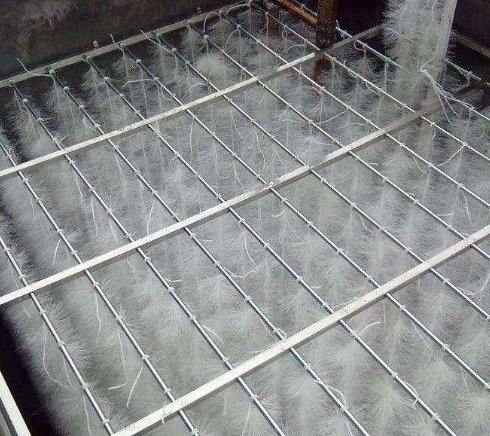 弹性填料筛选用聚烯烃类和聚酰胺中的几种耐腐、耐温、耐老化的品种,混合以亲水、吸附、抗热氧等助剂,采用特殊的拉丝、丝条制毛工艺,将丝条穿插同着在耐腐、高强度的中心绳上。由于选材和工艺配方精良,刚柔适度,使丝条呈立体均匀排列辐射状态,制成了悬挂式立体弹性填料的单体.填料在有效区域内能立体全方位均匀舒展满布,使气、水、生物膜得到充分混渗接触交换,生物膜不仅能均匀地着床在每一根丝条上,保持良好的活性和空隙可变性,而且能在运行过程中获得大的比表面积。