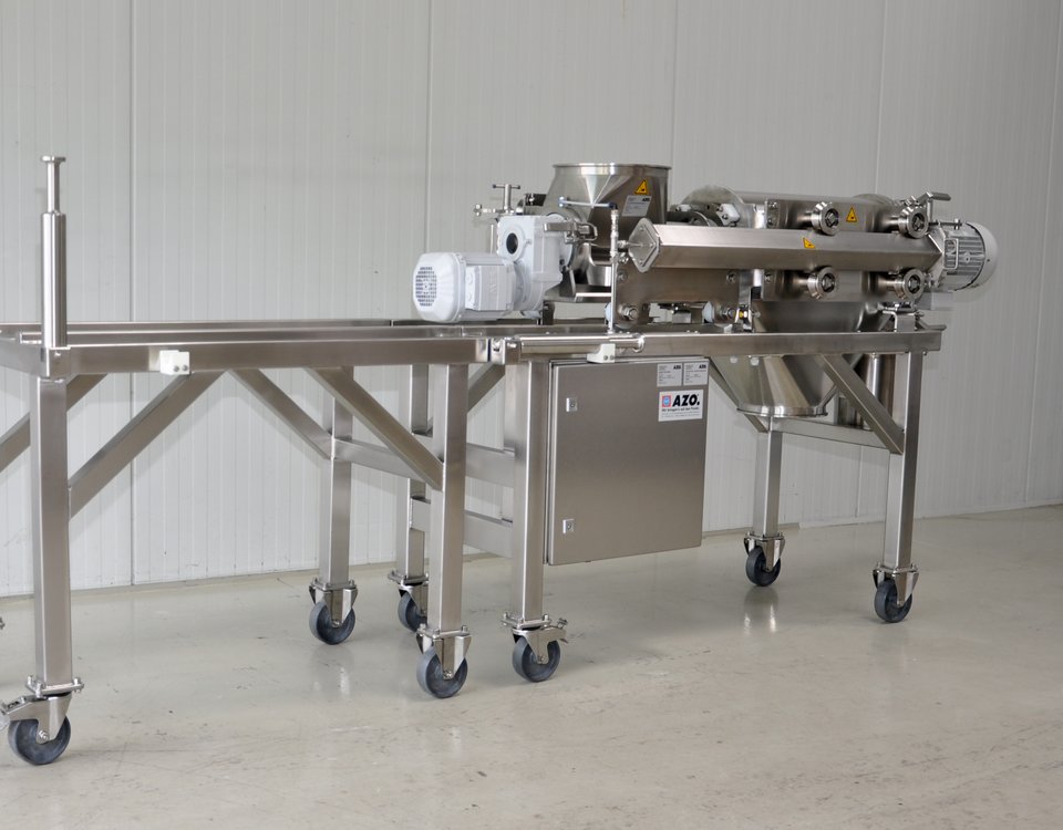 散料通过产品入口进入配料螺杆中,并被运输至筛网外罩中。筛分过程所需的散料配量可通过调节螺杆转速经由变频器按照产品特定的值来进行。散料被带旋杆的、单独驱动的进料分配器接收,并轻轻地旋动通过筛篮。细料穿过筛网掉进细料出口中,粗料被运输至粗料出口并在该处被分离出去。由于配有带快速接口的专用拉出装置,因此可轻松从筛网外罩中将筛篮拉出进行检查,并摆动至一侧。由此可快速进行确切的检查,并在必要时进行更换。配料螺杆同样可拉出和摆动。安全相关的连接均有电气保护装置(安全开关)提供防护,一旦打开,就会立即使机器停机。筛网罩固定在环上,可振动,因此得以自清洁。内置的挡板可防止过多的细料进入粗料出口中。
