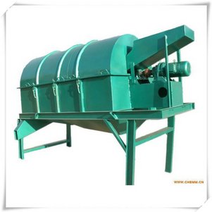 电动机经减速机与滚筒装置通过联轴器连接在一起,驱动滚筒装置绕其轴线转动。当物料进入滚筒装置后,由于滚筒装置的倾斜与转动,使筛面上的物料翻转与滚动,使合格物料(筛下产品)经滚筒外圆的筛网排出,不合格的物料(筛上产品)经滚筒末端排出。由于物料在滚筒内的翻转、滚动,使卡在筛孔中的物料可被弹出,防止筛孔堵塞。