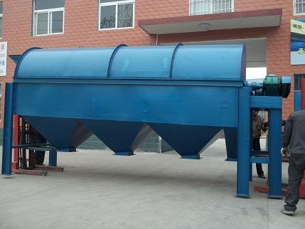 电机驱动滚筒轴线作旋转运动,减速机调节筒体以一定的转速旋转,物料由进料口进入筒体内,在旋转产生的离心力作用下,物料在筒内翻滚,自上而下通过分级筛网析出,由于筛网分级尺寸不同,物料逐渐被分离筛选,粒度合格的物料经筛分后落入到各自的漏斗,然后由人力方式运出或通过输送机自流送往成品站。合格产品经过下端出料口排出,颗粒较大,分选不合格的产品经另一排料口排出,筒内清理装置,使筛网不宜被阻塞。