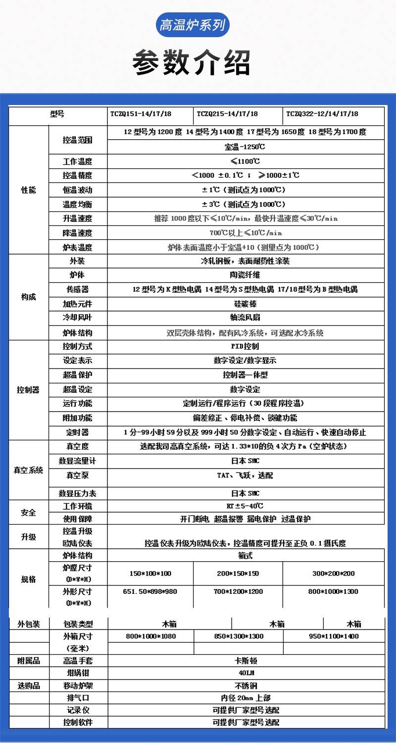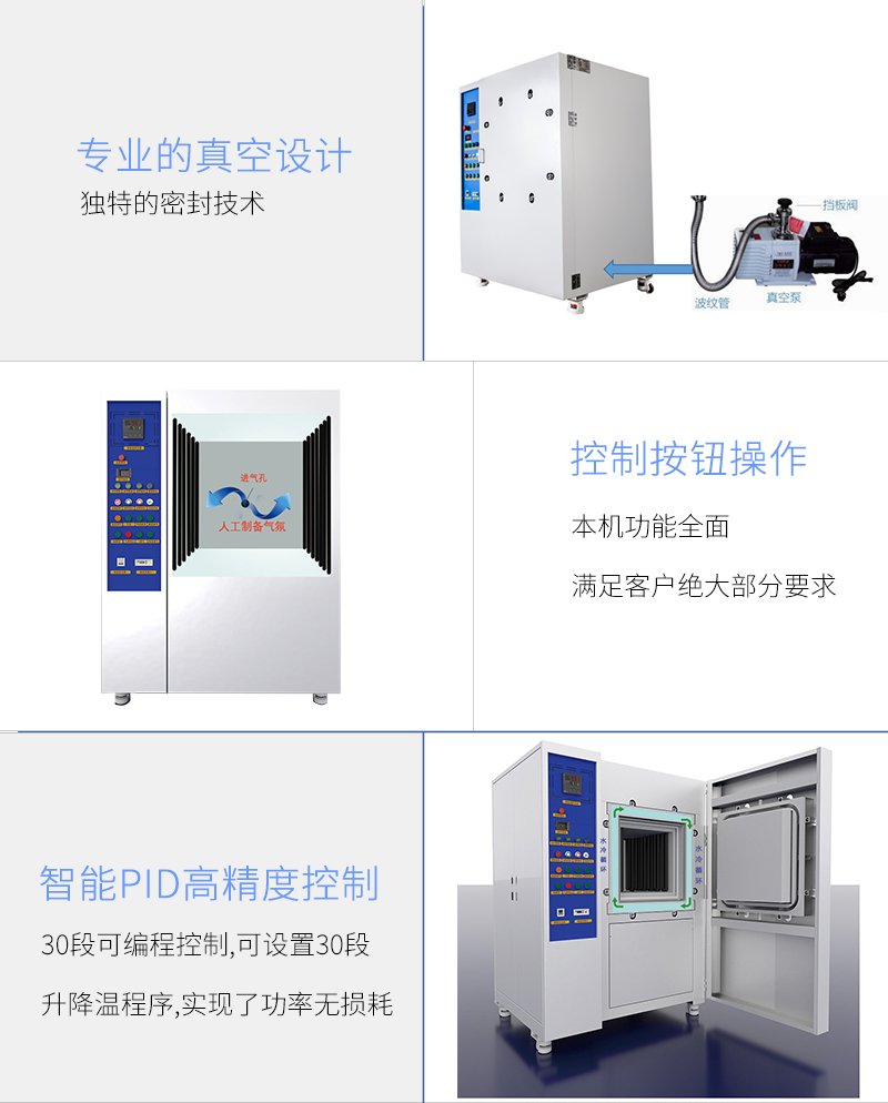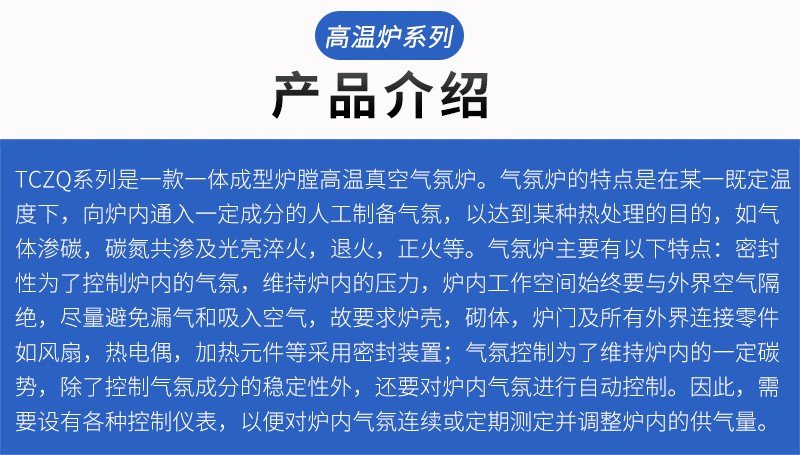TCZQ系列是一款一体成型炉膛高温真空气氛炉。气氛炉的特点是在某一既定温度下,向炉内通入一定成分的人工制备气氛,以达到某种热处理的目的,如气体渗碳,碳氮共渗及光亮淬火,退火,正火等。气氛炉主要有以下特点:密封性为了控制炉内的气氛,维持炉内的压力,炉内工作空间始终要与外界空气隔绝,尽量避免漏气和吸入空气,故要求炉壳,砌体,炉门及所有外界连接零件如风扇,热电偶,加热元件等采用密封装置;气氛控制为了维持炉内的一定碳势,除了控制气氛成分的稳定性外,还要对炉内气氛进行自动控制。因此,需要设有各种控制仪表,以便对炉内气氛连续或定期测定并调整炉内的供气量。